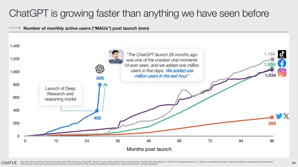 ChatGPT is the fastest growing software application of all time, and it’s not even close. As the slide below from Coatue’s East Meets West presentation shows, it’s on track to reach a billion monthly active users in half the time of the most successful consumer apps, like TikTok, Facebook, and Instagram.