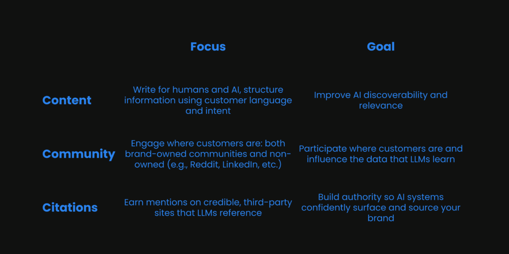 The Three C’s work together: Content built around customer language gets discussed in communities, which generates citations, which trains AI systems to surface solutions when users ask about problems. Companies optimizing for only one dimension miss how these elements compound.